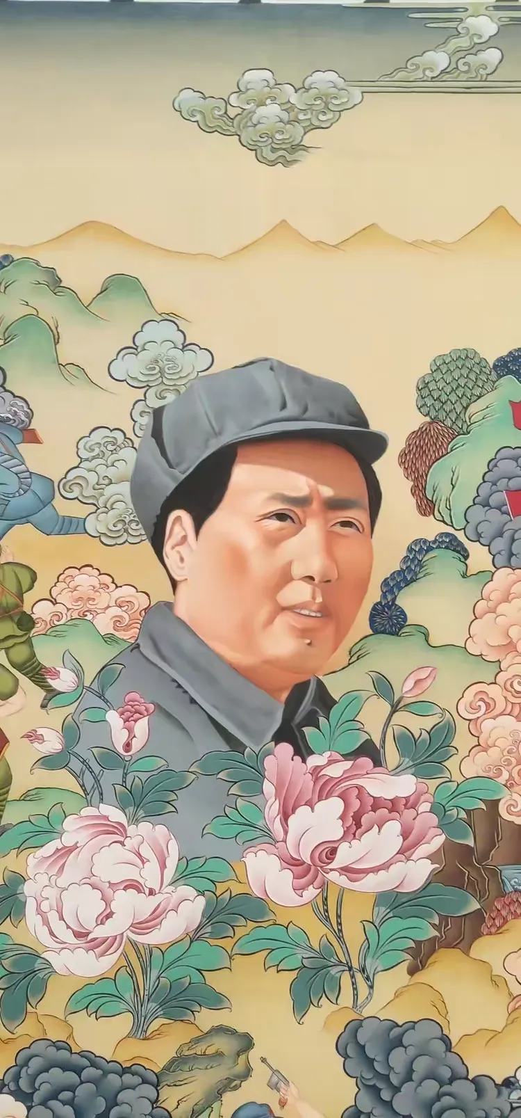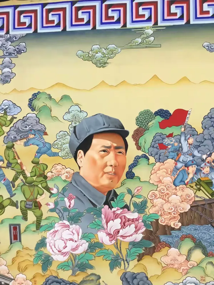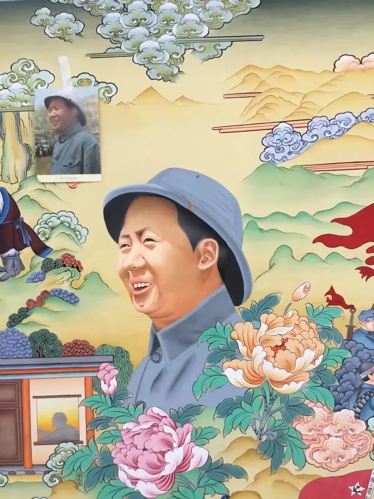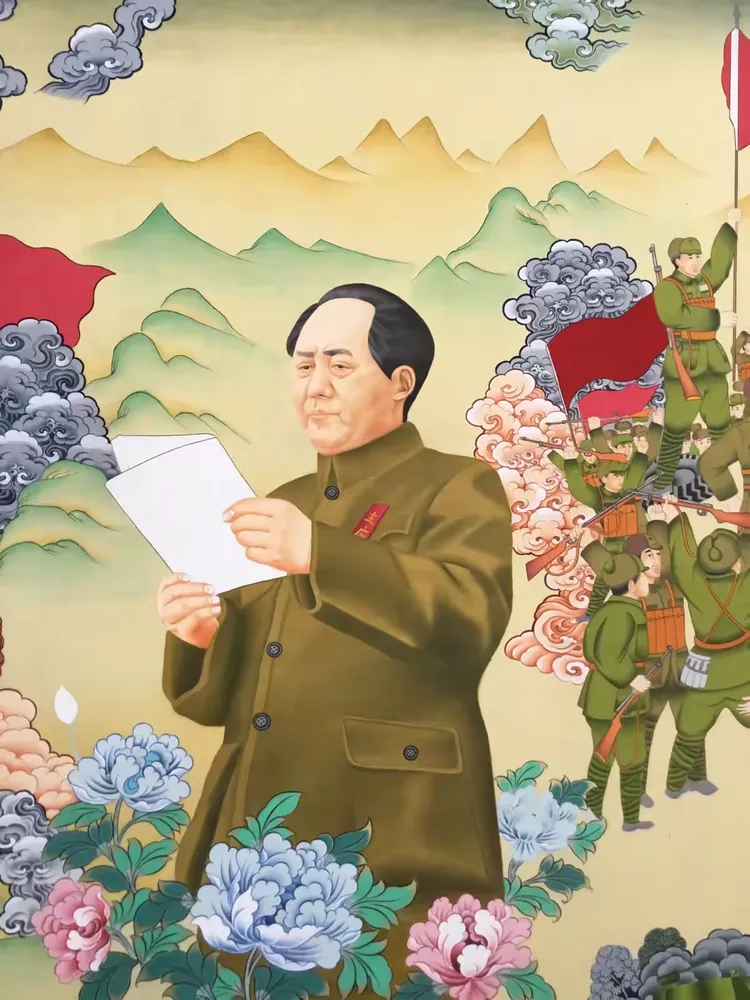 众所周知1935年毛主席到达陕北之后,在陕北地区生活了十三个年头。在这十三年间,毛主席一直都是吃着当地的小米与黑豆,与陕北人民休戚相关。在陕北生活的日子中,中共中央红军与当地的老百姓建立起了深厚的友谊。有人称:“毛主席与人民群众有着一种特殊的友好关系,他好像永远生活在人民群众之中”唐卡局部