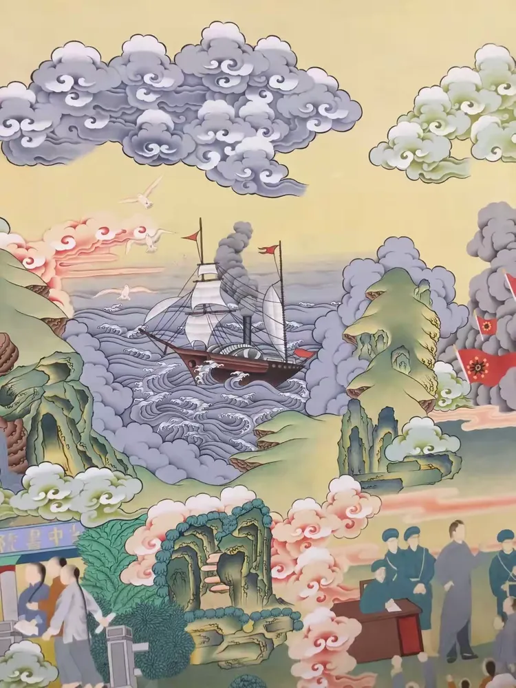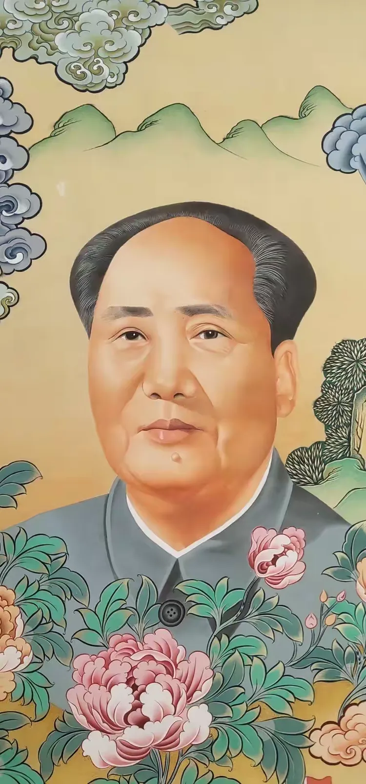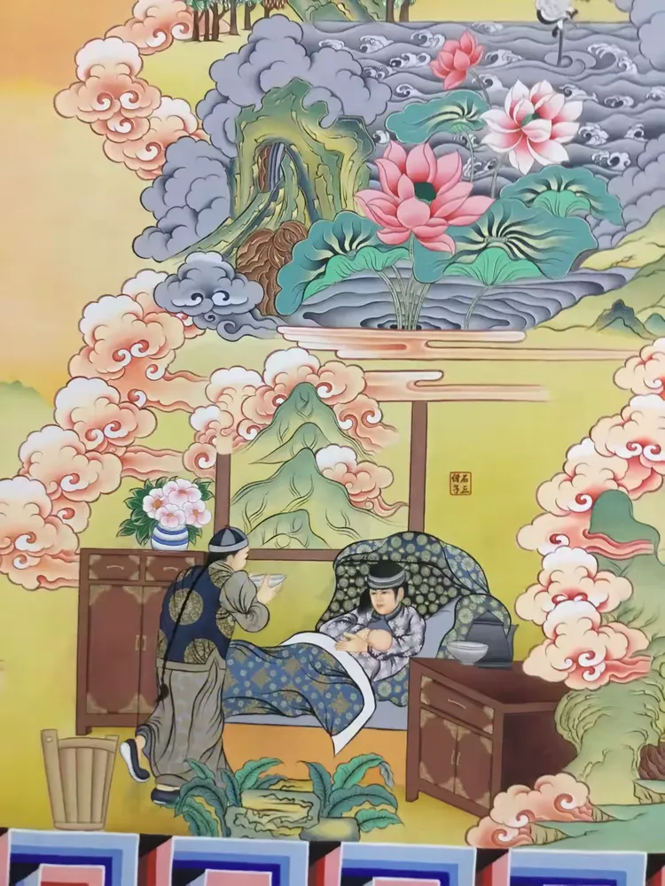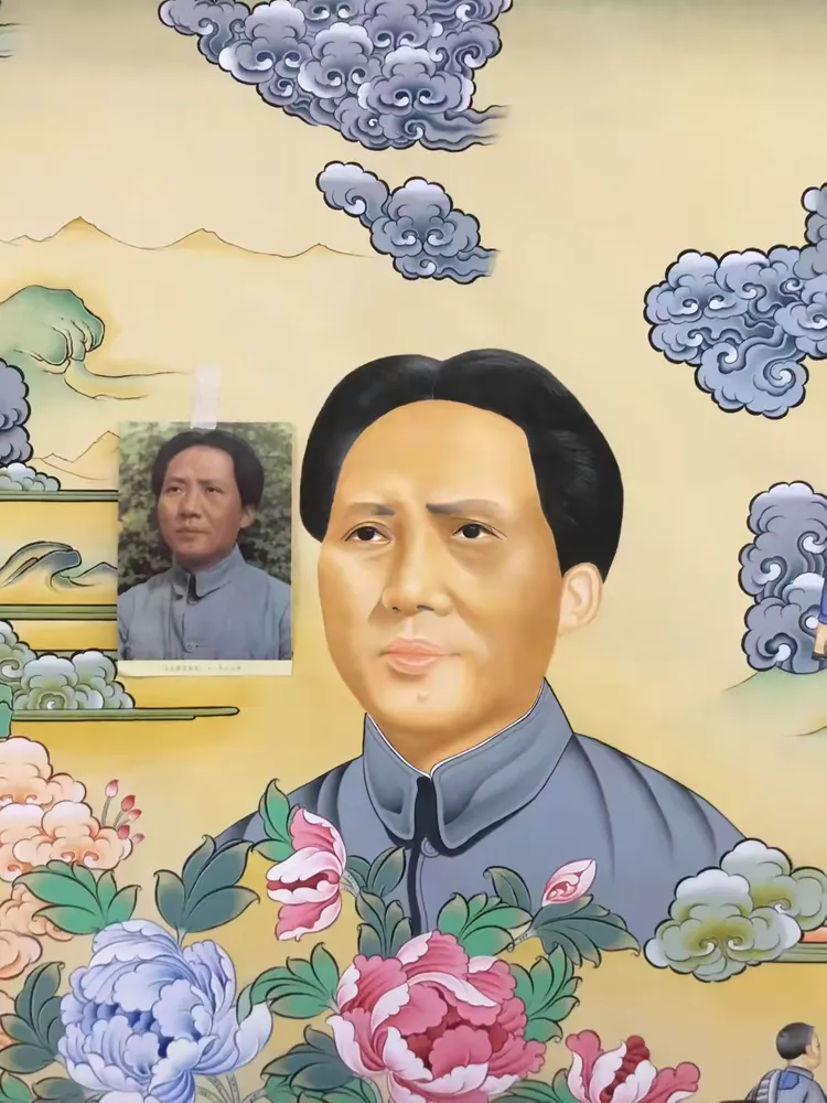 众所周知1935年毛主席到达陕北之后,在陕北地区生活了十三个年头。在这十三年间,毛主席一直都是吃着当地的小米与黑豆,与陕北人民休戚相关。在陕北生活的日子中,中共中央红军与当地的老百姓建立起了深厚的友谊。有人称:“毛主席与人民群众有着一种特殊的友好关系,他好像永远生活在人民群众之中”唐卡局部