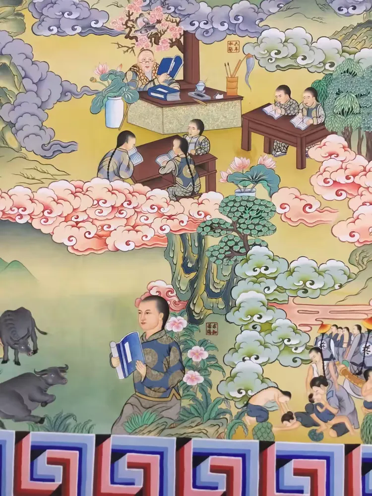 也正因为藏族同胞对毛主席有这么深的感情,才会创作出这幅旷世珍宝般的《世界伟人---毛泽东》的唐卡,下图为这幅唐卡的局部这幅长达49.1米的唐卡,里面涉及到一万两千多个人物,表现了毛主席在中华历史中丰功伟绩的方方面面,所以,这幅唐卡,不仅仅是艺术上的瑰宝,也是人类历史和思想上的瑰宝。唐卡,既是代表着藏族人民的一种美好祝愿的仪式用品,也是西藏独有的艺术形式,唐卡这种绘画形式,不同于其他的绘画方式,因为绘制唐卡的颜料,都是天然的矿物颜料,是用各种具有颜色的自然产物制作成颜料去绘制的,如金、银、珍珠、各种颜色的宝石、孔雀石、珊瑚、朱砂等,这样绘制出来的卷幅,不同于其他的颜料绘制出来的作品,唐卡,能够保持千年不变颜色,并一直保持着色泽的鲜艳,因此,真正的唐卡即便是不看其艺术价值,仅仅用料就是非常昂贵的,而这幅《世界伟人--毛泽东》的唐卡,仅仅是造价就已经超过了4百万,更不要说其艺术价值和思想价值,所以,说是旷世珍宝一点也不为过!
